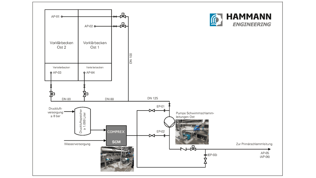 For this reason, the integration of a single COMPREX® unit is sufficient for cleaning the four primary settling tanks. Although the COMPREX® pulses are to be fed directly into the pipeline to be cleaned, the connection points of the floating sludge lines West and East are only 5 m apart, so that only short connecting lines have to be installed for VKB-West.