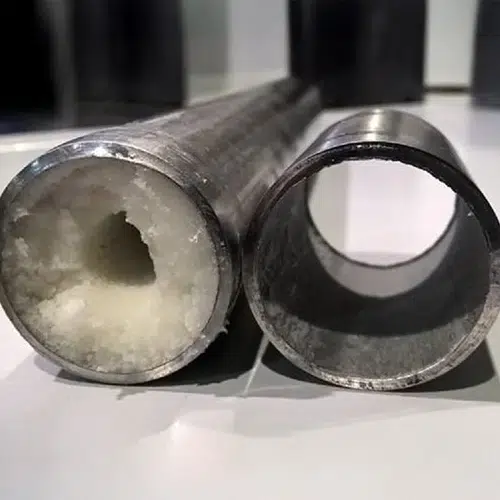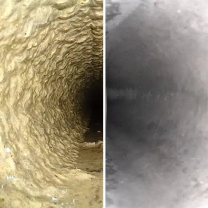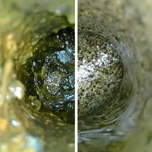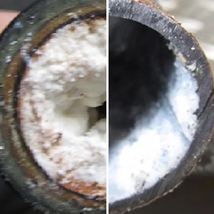 Wachsartige Ablagerungen in einer KSS-Rohrleitung vor und nach der Reinigung