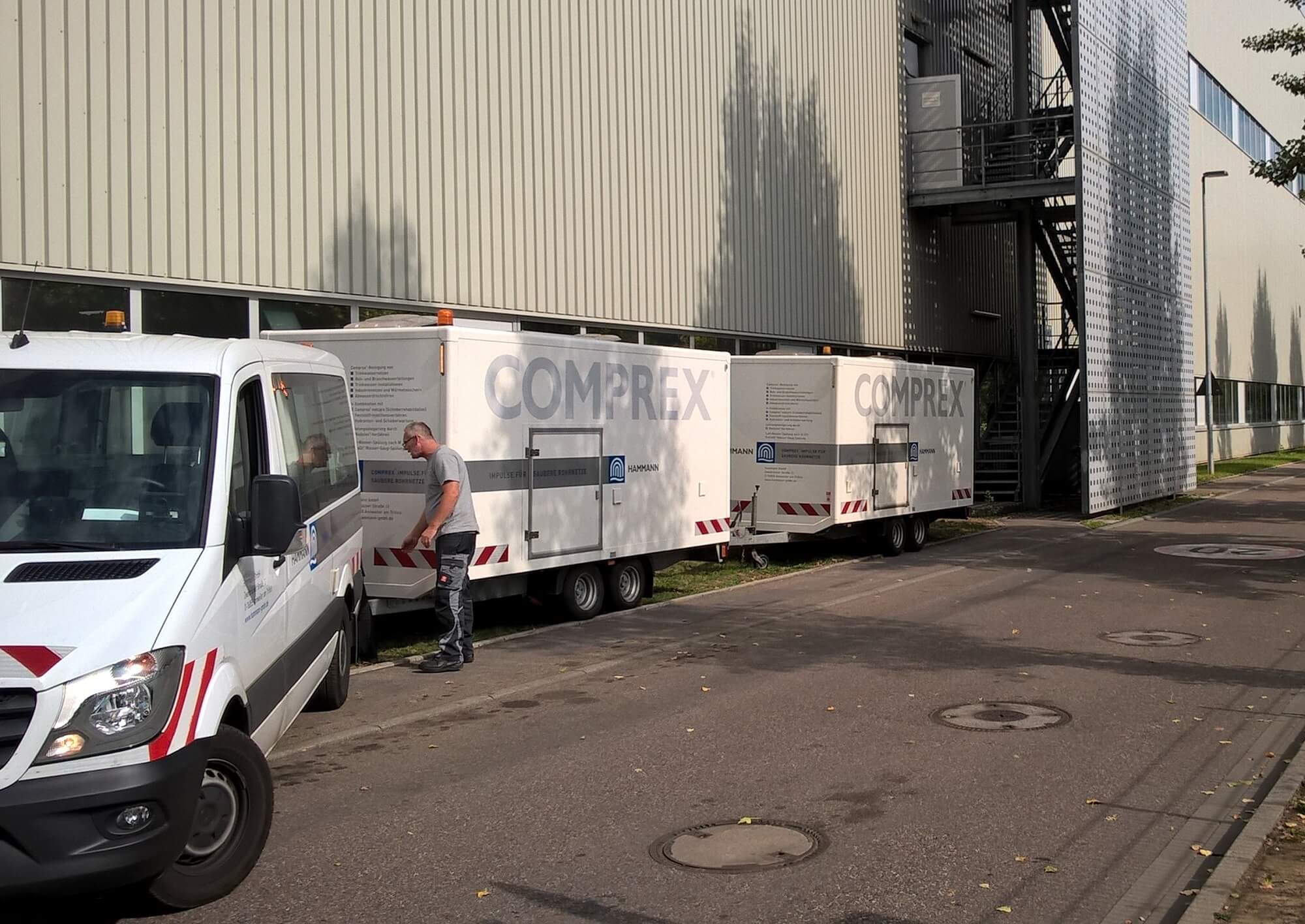 - Reinigung der Rohrleitungen mit dem Comprex®-Verfahren; bei geringem Abwasseranfall und durch den Auftraggeber vorgegebenem Zeitfenster